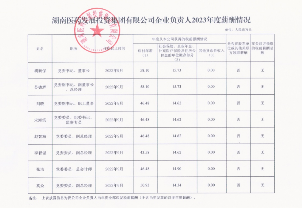 湖南医药发展投资集团有限公司企业负责人2023年度新酬情况公示