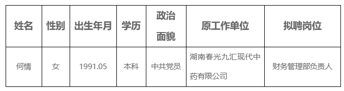 为加强对人才任用工作的监督,提高识别和任用的准确程度,现对公司研究决定的财务管理部负责人拟聘任人选进行任前公示: